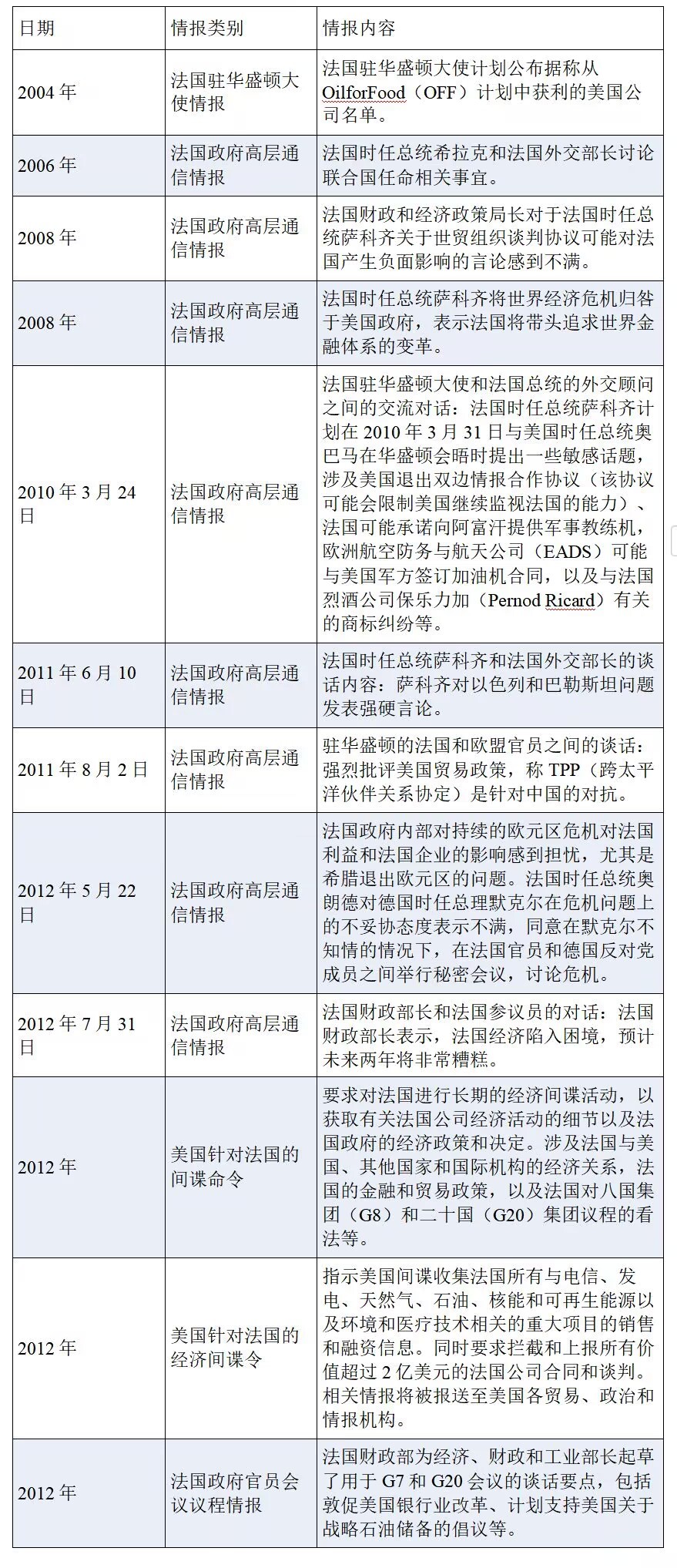 在2004年至2012年期間,美國(guó)對(duì)法國(guó)實(shí)施了長(zhǎng)期的間諜行動(dòng),監(jiān)聽對(duì)象包括前法國(guó)總統(tǒng)、法國(guó)財(cái)政部長(zhǎng)、法國(guó)外交部長(zhǎng)、法國(guó)參議員、法國(guó)財(cái)政和經(jīng)濟(jì)政策局官員、法國(guó)駐美國(guó)大使,以及直接負(fù)責(zé)歐盟貿(mào)易政策的官員等。監(jiān)聽內(nèi)容涉及法國(guó)政府政策、外交、金融、國(guó)際交流、基礎(chǔ)設(shè)施建設(shè)、商業(yè)和貿(mào)易活動(dòng)等,其中一些重要情報(bào)被美國(guó)授權(quán)與“五眼聯(lián)盟”伙伴國(guó)家共享,揭示了“五眼聯(lián)盟”國(guó)家亦為美國(guó)間諜行動(dòng)的獲益者。