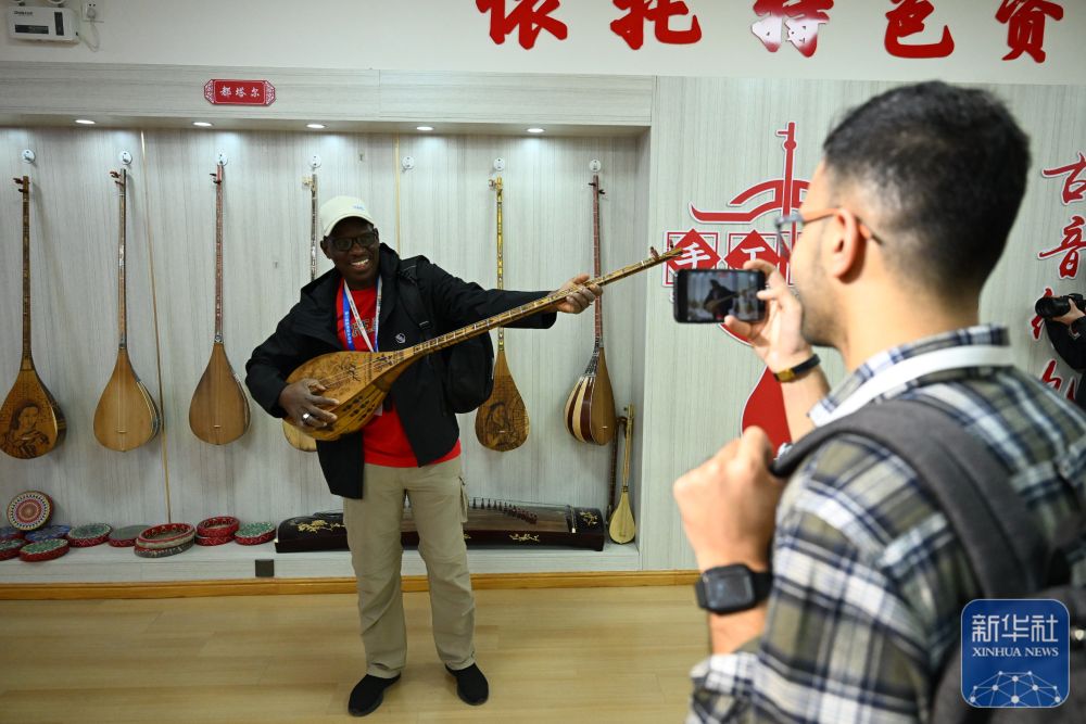 10月15日,與會嘉賓在阿克蘇地區(qū)新和縣加依村加依手工樂器產業(yè)園體驗傳統(tǒng)樂器。