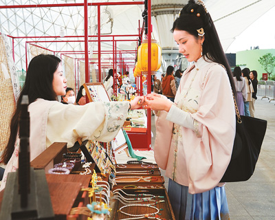 華服愛好者在二〇二四年“中國華服周·滬上繁花”國風市集上挑選飾品。新華社記者 劉穎攝