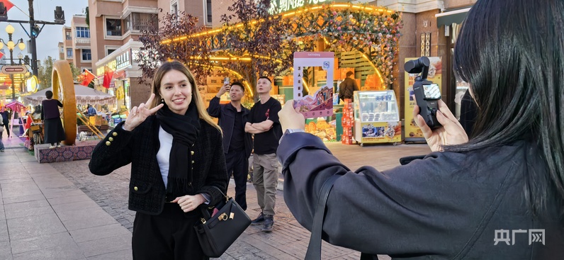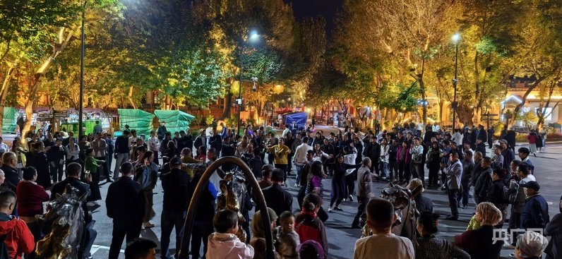 除了庫爾德寧的自然景觀,伊寧市六星街、喀贊其文化旅游區(qū)也深得旅游博主吳思瑤的青睞。夜晚的六星街,當歡快的音樂響起,各族群眾不約而同地跳了起來,看到這一幕,吳思瑤迫不及待地沖向前:“啊,我要拍……”