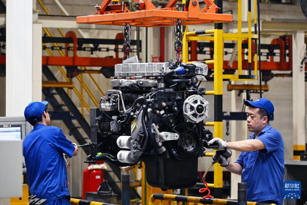 在濰柴集團(tuán)車間內(nèi),工人在裝配發(fā)動(dòng)機(jī)(8月21日攝)。新華社記者 李紫恒 攝