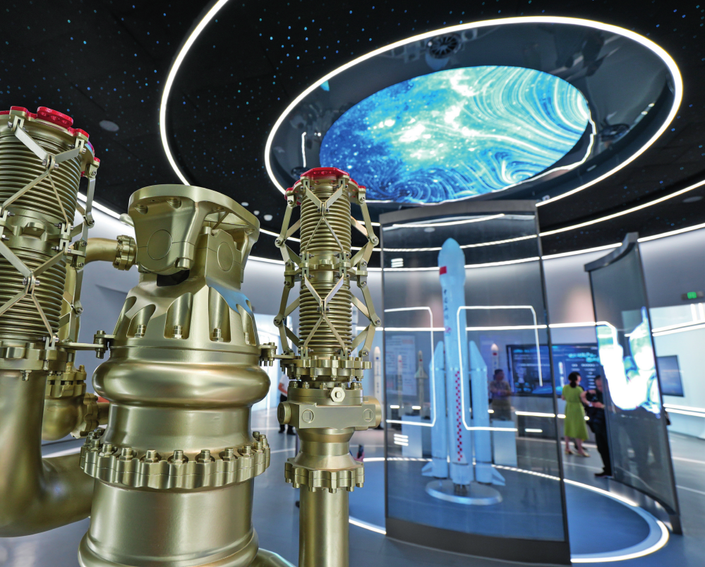 在無(wú)錫商業(yè)航天展示館拍攝的火箭發(fā)動(dòng)機(jī)模型(2024 年 9 月 9 日攝) 楊磊攝 / 本刊