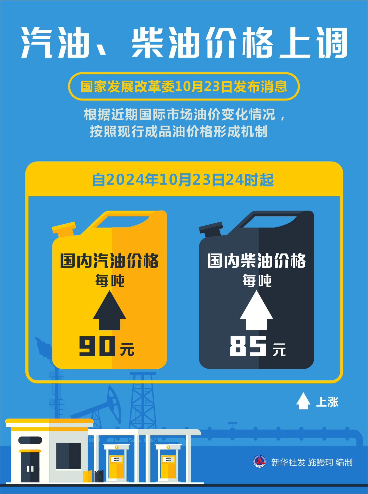 國(guó)家發(fā)展改革委23日發(fā)布消息,根據(jù)近期國(guó)際市場(chǎng)油價(jià)變化情況,按照現(xiàn)行成品油價(jià)格形成機(jī)制,自2024年10月23日24時(shí)起,國(guó)內(nèi)汽、柴油價(jià)格每噸分別上漲90元和85元。