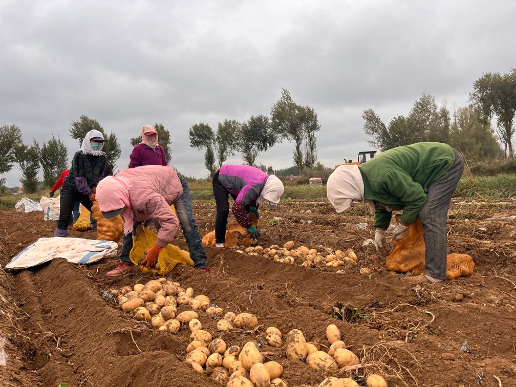 在甘肅省張掖市山丹縣甘農薯7號綠色標準化連片示范基地里,村民正在撿收馬鈴薯。(受訪者供圖)