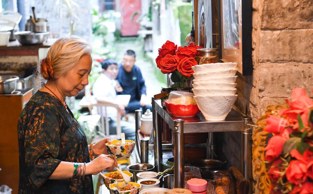 現(xiàn)在周英碧在山城巷經(jīng)營(yíng)著一家小吃店,旺季時(shí)每天能接待上百個(gè)客人。她最喜歡的事就是閑時(shí)和游客“擺擺龍門(mén)陣”,給他們講一講山城巷的故事。