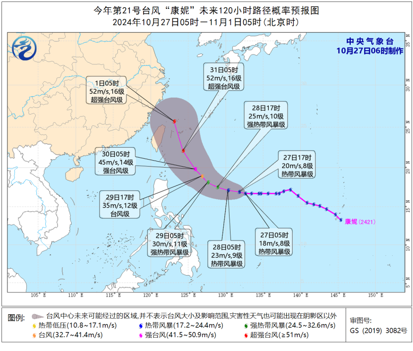 預(yù)計,“康妮”將以每小時10至15公里的速度向偏西方向移動。29日開始轉(zhuǎn)向西北方向移動,逐漸向臺灣島東部海面靠近,強度逐漸增強,最強可達強臺風級或超強臺風級(48至55米/秒,15至16級)。