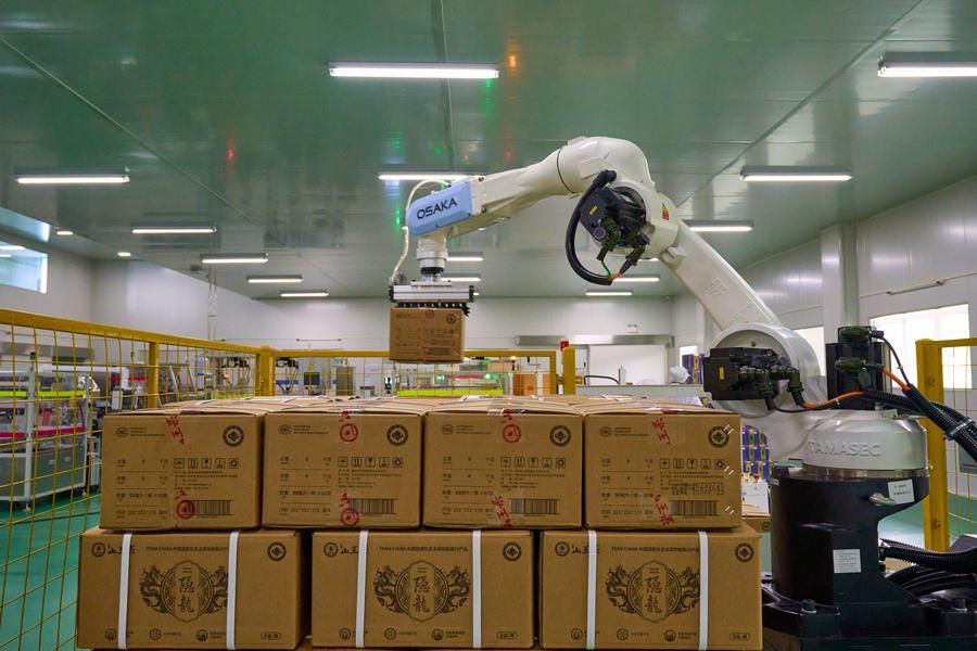 貴州山王果健康實(shí)業(yè)有限公司5G智慧工廠全自動(dòng)包裝線正在工作。(新華社發(fā))