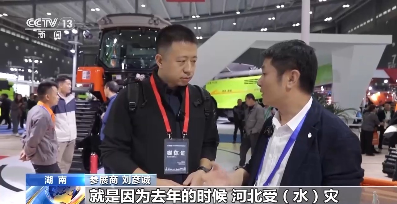 參展商 劉彥誠:這個(gè)履帶底盤,就是因?yàn)槿ツ旰颖笔芩疄?zāi),很多輪式的玉米收割機(jī)下不了地,干不了活,就委托我們給他們專門研發(fā)這一款履帶底盤。