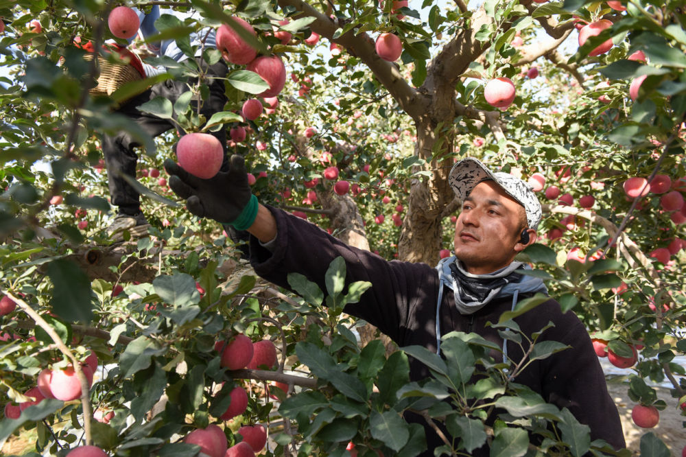 10月23日,在新疆阿克蘇地區(qū)紅旗坡農(nóng)場(chǎng),果農(nóng)在采摘蘋果。新華社記者 高晗 攝