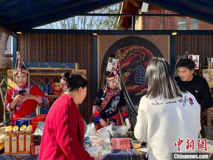圖為黃予心(中)在江西吉安金坪民族鄉(xiāng)八寨集市售賣畬族特產(chǎn)。中新網(wǎng)記者劉子衿 攝