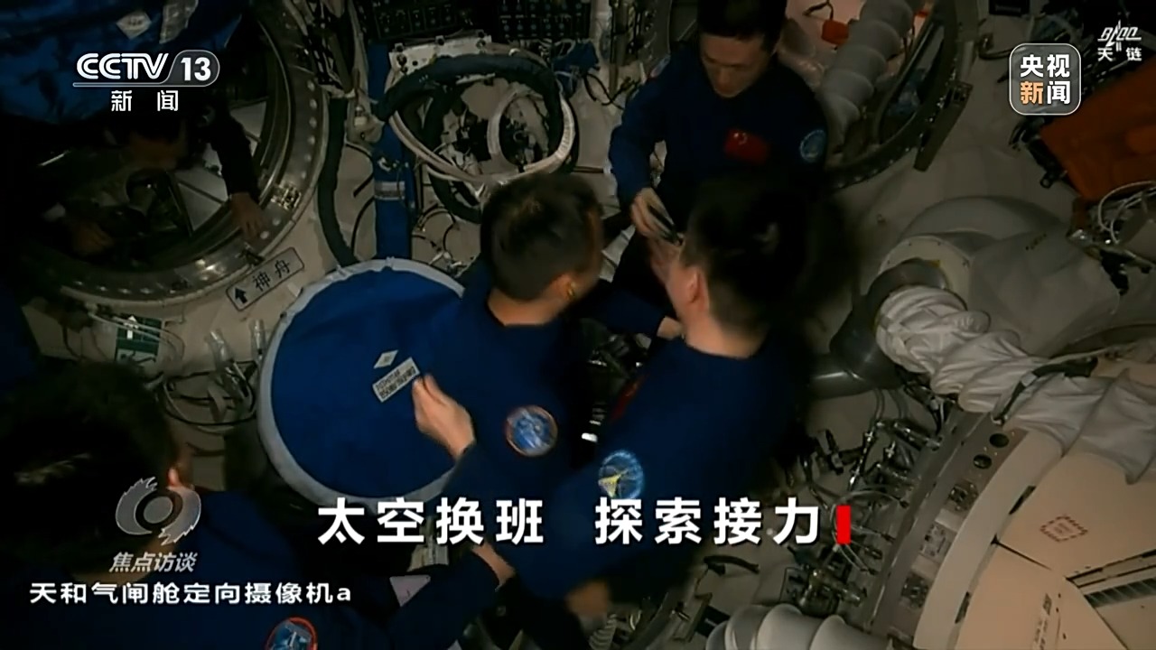 重返中國空間站的神十九航天員蔡旭哲打開艙門,再次體驗(yàn)失重,他輕松地就從飛船進(jìn)入空間站節(jié)點(diǎn)艙,和等待他們到來的神十八乘組來了一個大擁抱。第一次進(jìn)入空間站的兩位“90后”航天員也同樣受到了熱烈的歡迎。在打掃一新的空間站核心艙,歡迎儀式必不可少。