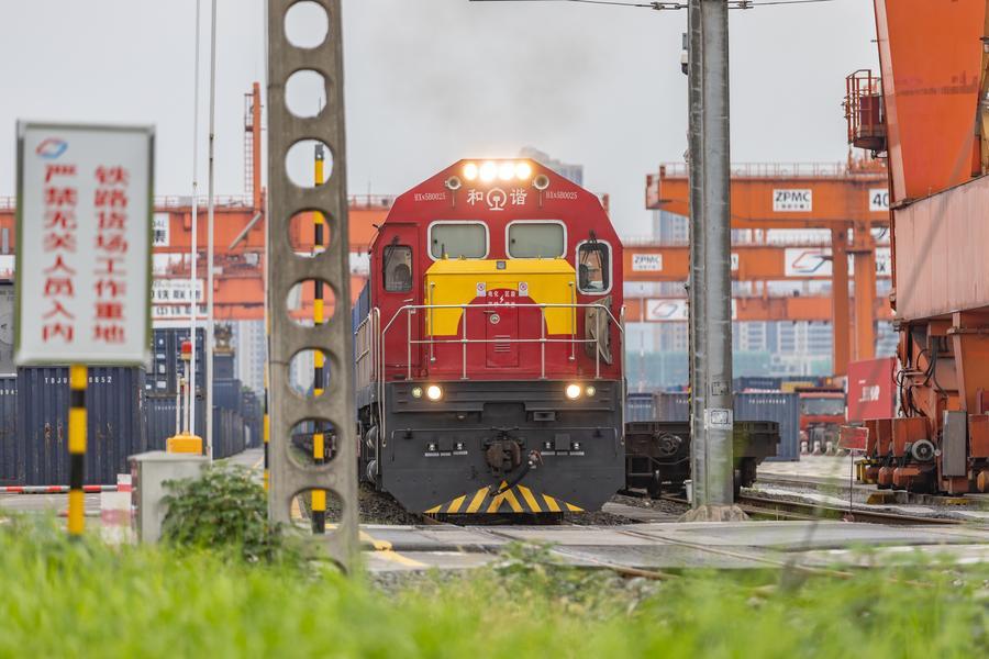 2024年7月30日,在重慶國際物流樞紐園區(qū),一列裝載機械設備、汽車和筆記本電腦的中歐班列從重慶團結(jié)村中心站駛出。新華社記者 黃偉 攝