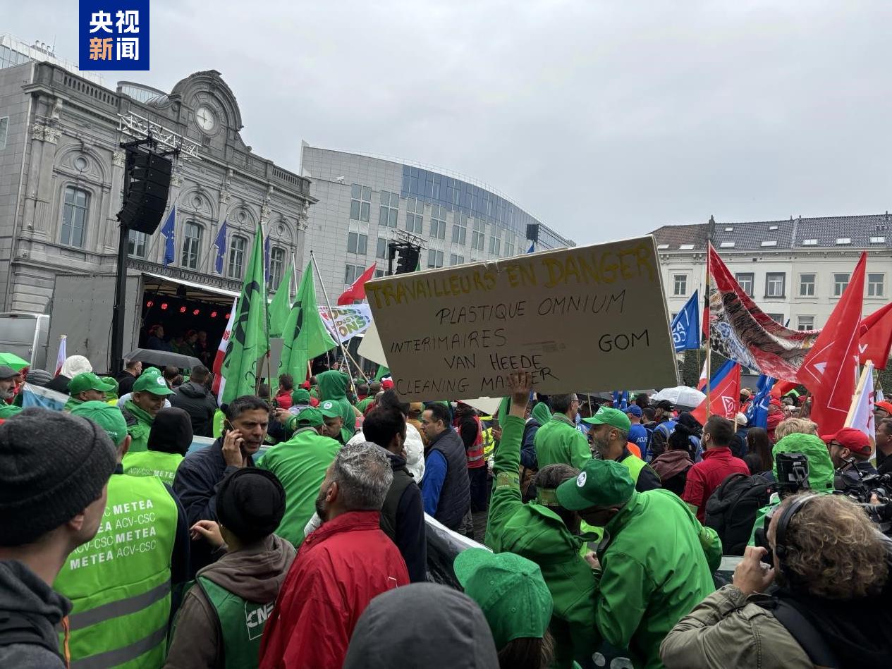 9月16日,比利時一家奧迪工廠工人在布魯塞爾市中心的盧森堡廣場舉行示威活動(總臺記者顧鑫拍攝)