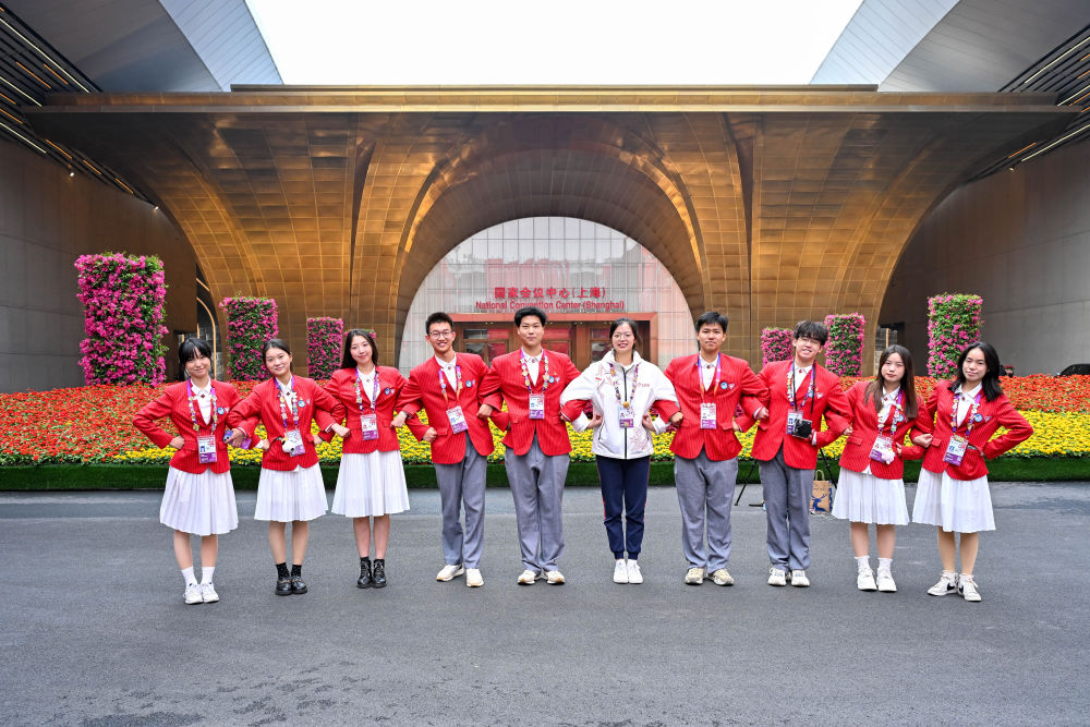 11月4日,志愿者在第七屆中國(guó)國(guó)際進(jìn)口博覽會(huì)舉辦場(chǎng)地——國(guó)家會(huì)展中心(上海)合影。