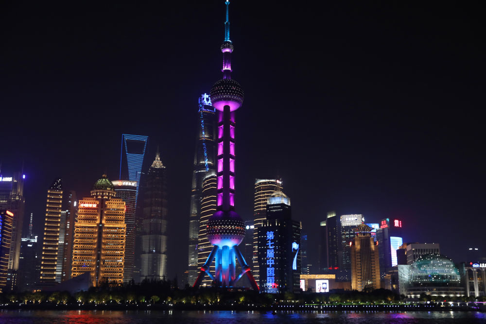 11月3日,位于上海陸家嘴的東方明珠廣播電視塔和大樓亮起主題燈光,迎接第七屆中國(guó)國(guó)際進(jìn)口博覽會(huì)開(kāi)幕。