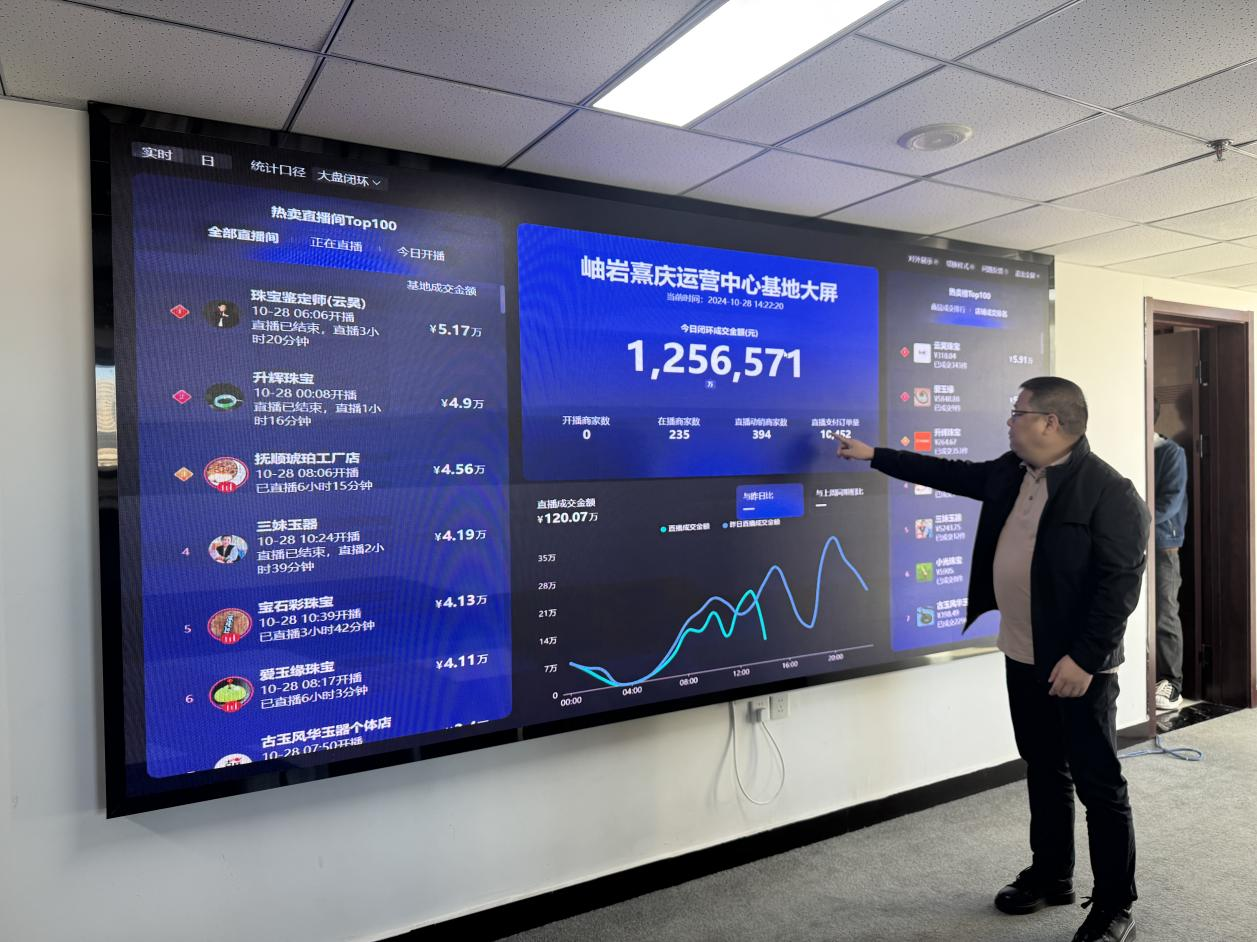 “1256571元,這是我們一上午的交易額”,岫巖熹慶運(yùn)營(yíng)中心的負(fù)責(zé)人指著墻上的大屏幕說:“通過這塊屏幕,不僅能實(shí)時(shí)看到各家商戶的開播、交易情況,還可以通過數(shù)據(jù)的波動(dòng)及時(shí)發(fā)現(xiàn)存在的問題?!?/p>