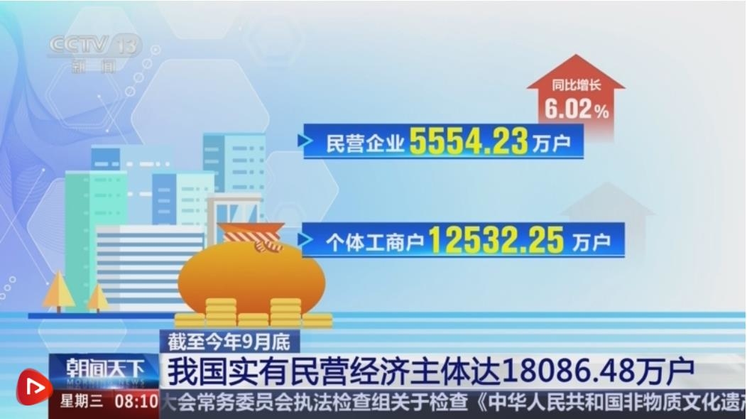 市場監(jiān)管總局11月6日公布我國經(jīng)營主體發(fā)展數(shù)據(jù)顯示,截至2024年9月底,我國實有民營經(jīng)濟主體總量達18086.48萬戶。我國民營經(jīng)濟主體數(shù)量持續(xù)穩(wěn)步提升。