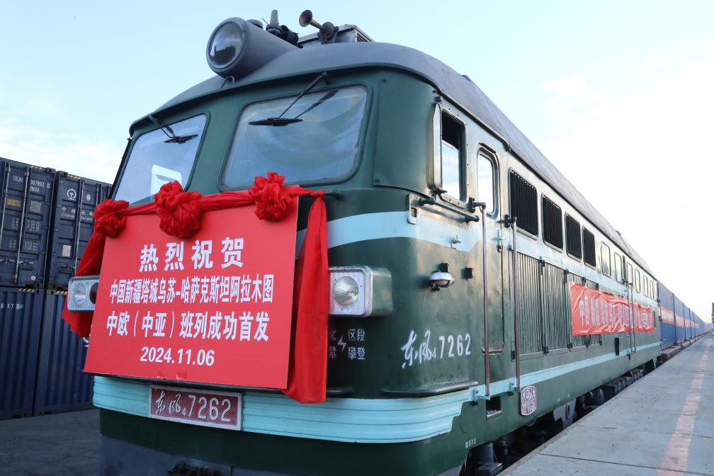 11月6日,在新疆塔城地區(qū)烏蘇鐵路貨場(chǎng),中國(guó)新疆塔城烏蘇—哈薩克斯坦阿拉木圖中歐(中亞)班列首發(fā)。新華社記者 初杭 攝