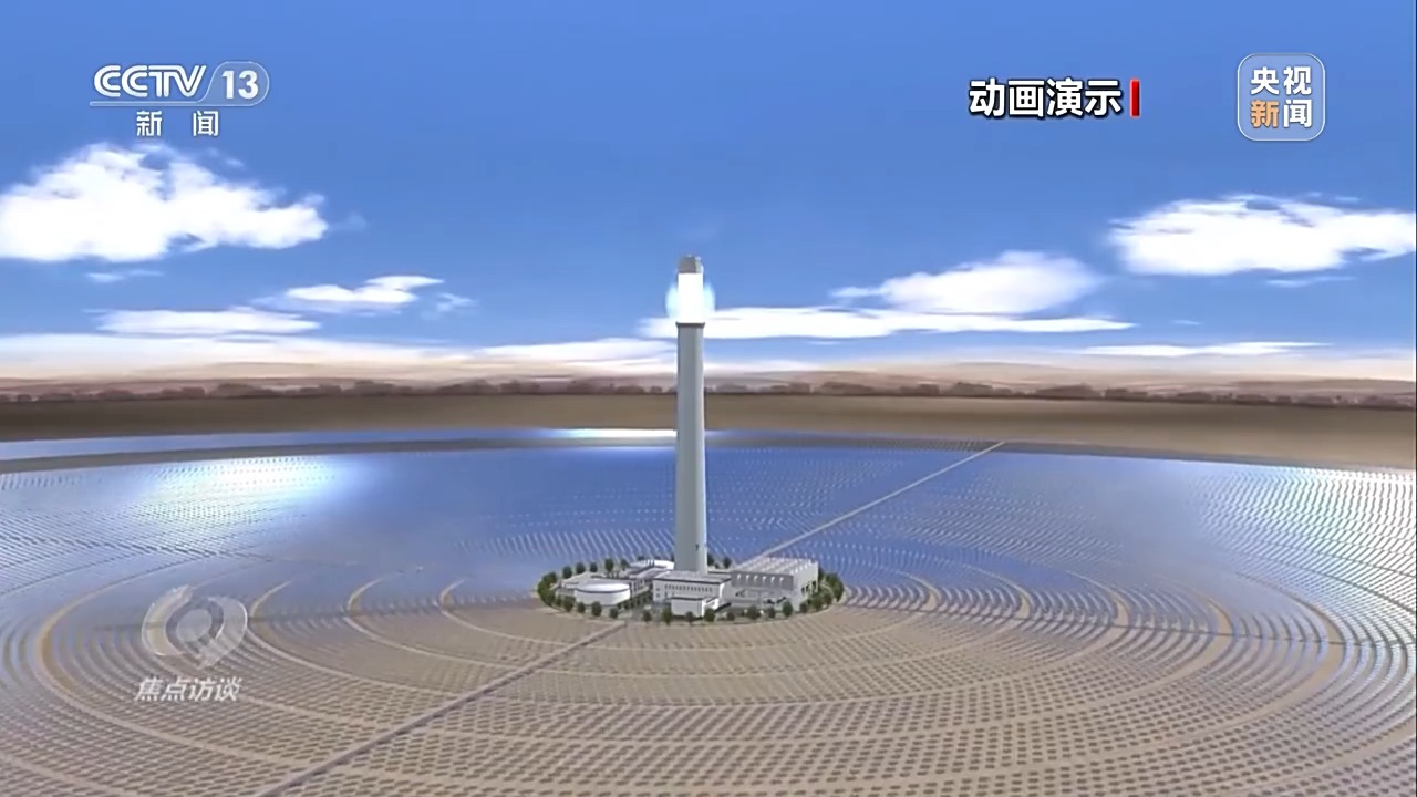 電站通過高精度智能定日鏡,實(shí)時跟蹤太陽的運(yùn)動,將太陽直接輻射光反射聚集到吸熱塔上,將吸熱塔內(nèi)的熔鹽加熱到560多℃的高溫,將高溫的熔鹽進(jìn)行儲存,在需要發(fā)電時再通過高溫熔鹽與水進(jìn)行熱交換,產(chǎn)生高溫高壓的蒸汽,驅(qū)動汽輪發(fā)電機(jī)組發(fā)電。