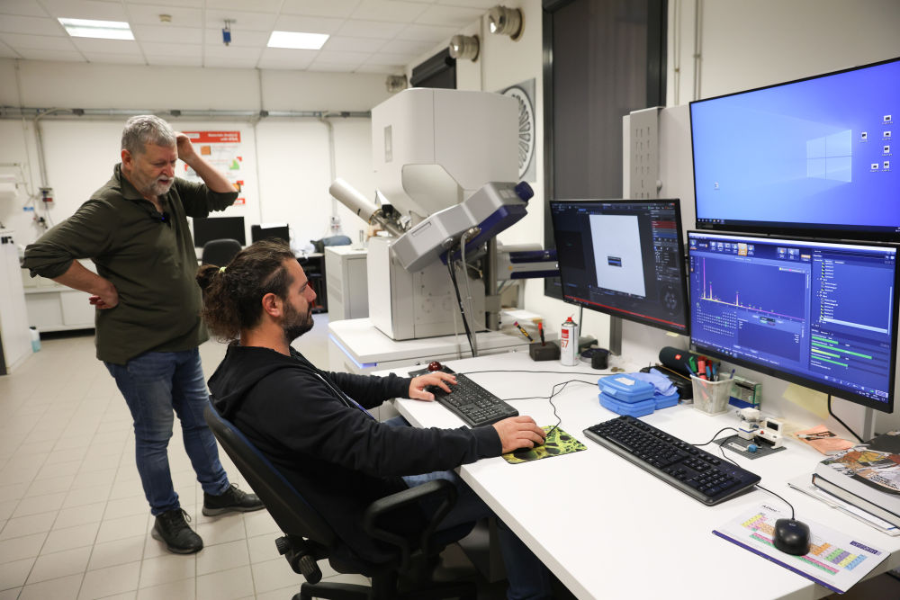 11月6日,意大利帕多瓦大學(xué)文化遺產(chǎn)學(xué)院教授馬西莫·維達(dá)萊(左)與研究人員在實(shí)驗(yàn)室討論青銅獅樣本檢測(cè)分析過程。新華社記者李京攝