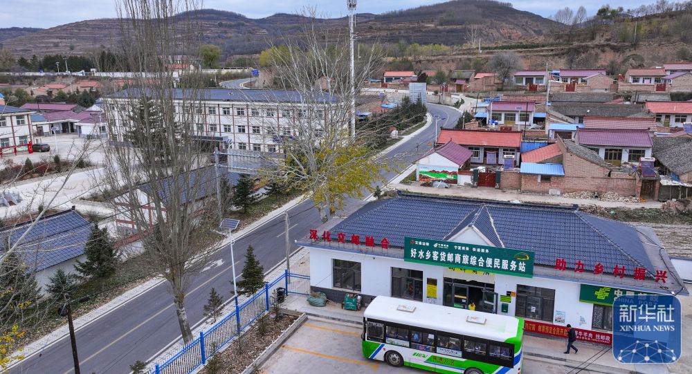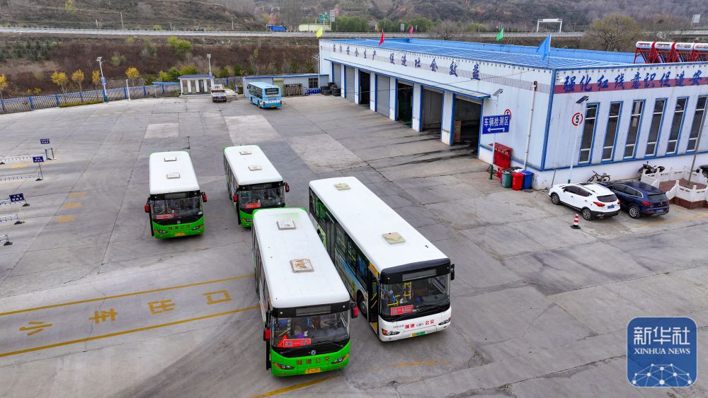載有快遞物品的城鄉(xiāng)公交車即將從隆德縣公交公司駛出(11月9日攝,無人機照片)。