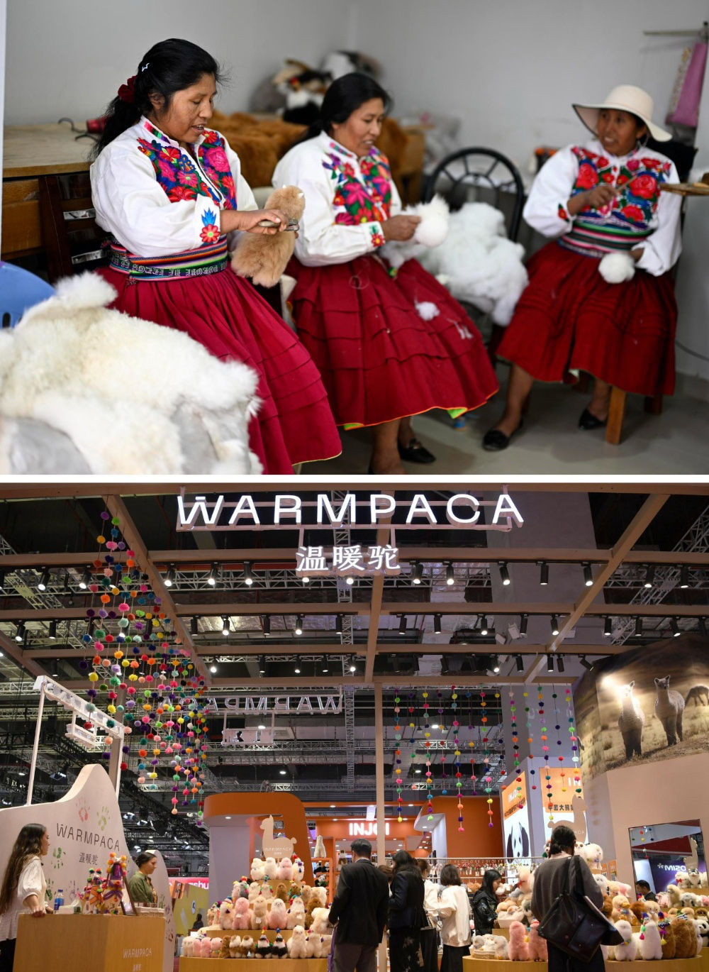 2016年,中國姑娘馬玉霞在秘魯阿雷基帕街邊市場購買了秘魯羊駝毛制品手工藝人奧斯瓦爾多·馬馬尼的羊駝毛玩偶并引入中國市場。通過連續(xù)參展進(jìn)博會(huì),羊駝毛制品在中國市場大受歡迎,并創(chuàng)立了中文品牌“溫暖駝”。今年,秘魯品牌“溫暖駝”連續(xù)第七年亮相進(jìn)博會(huì),受到更多中國消費(fèi)者的喜愛。目前,“溫暖駝”品牌已入駐國內(nèi)30多家商場,并且開拓了電商平臺(tái)線上銷售,年銷量超過3萬只。上圖:2024年6月20日,在秘魯阿雷基帕,工作人員在羊駝毛制品手工藝人奧斯瓦爾多·馬馬尼的工坊制作羊駝玩偶。下圖:2024年11月5日在上海拍攝的第七屆進(jìn)博會(huì)秘魯“溫暖駝”展臺(tái)。