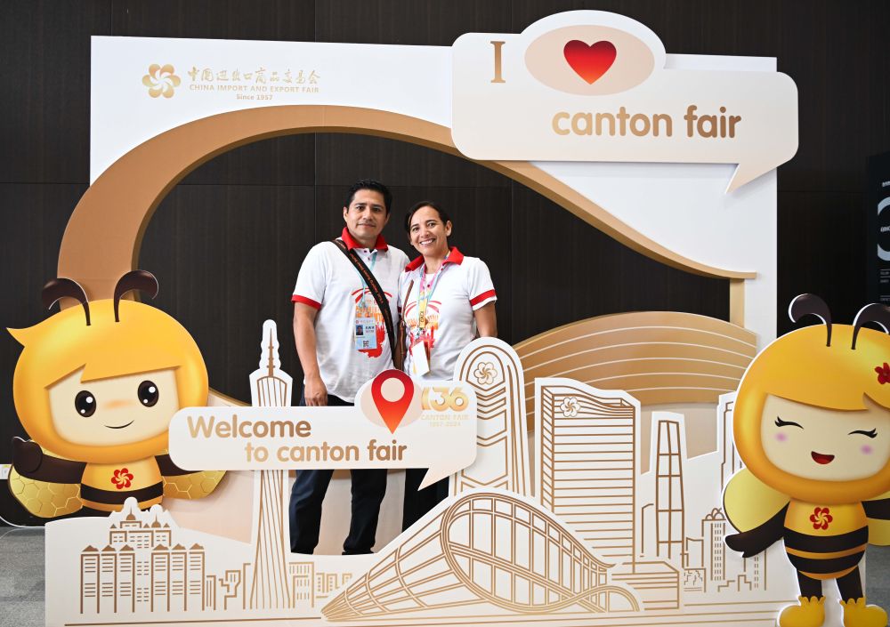 2024年10月15日,來自秘魯?shù)牟少徤淘趶V州舉行的廣交會(huì)上合影留念。