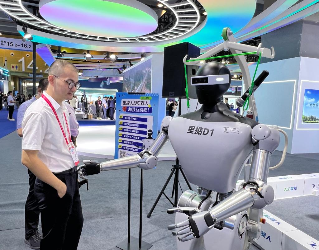 圖為“里掂人形機(jī)器人”和觀眾交流互動。新華社發(fā)(李俊豪 攝)
