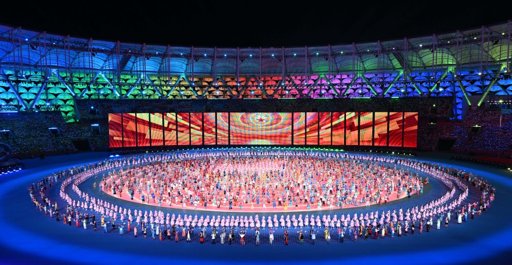 舞臺(tái)中間是一個(gè)圓形地屏,地屏外圈,導(dǎo)演組專門(mén)增加“星空矩形”地毯,圍繞中心地屏影像始終保持圓形圖案,構(gòu)成“同心圓”;在入場(chǎng)儀式、節(jié)目展演、點(diǎn)燃火炬等多個(gè)環(huán)節(jié),身穿各民族傳統(tǒng)服飾的參賽人員、表演者等,多次在舞臺(tái)匯聚成“同心圓”;“一顆心,一個(gè)圓,一齊擁抱緊相連……”“同心圓”概念也在主題曲中彰顯。