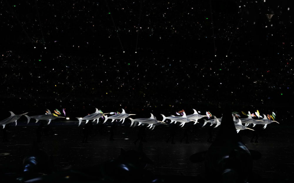 在全場(chǎng)觀眾“哇”的一聲驚嘆中,整座體育場(chǎng)化身星辰大海。騎自行車、滑輪滑、腳踩平衡車的演員們手舉海龜、鯊魚(yú)、海豚等形象魚(yú)貫而入,讓觀眾如置海底。隨后,高鐵飛馳、深海探測(cè)、火箭發(fā)射、太空行走等畫(huà)面在星海中逐一呈現(xiàn),展現(xiàn)了我國(guó)在高科技領(lǐng)域的發(fā)展成就,帶來(lái)生動(dòng)的沉浸式體驗(yàn)。