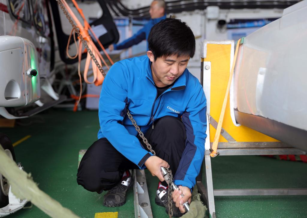 執(zhí)行中國第41次南極考察任務的“雪龍”號和“雪龍2”號于北京時間2024年11月19日開始穿越“咆哮”西風帶。這是“雪龍2”號直升機機組成員畢凌峰在擰緊直升機固定件。新華社記者黃韜銘攝