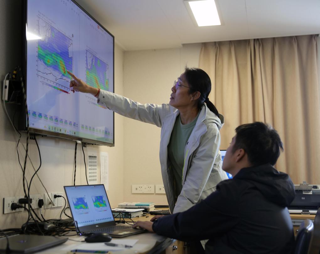 執(zhí)行中國第41次南極考察任務的“雪龍”號和“雪龍2”號于北京時間2024年11月19日開始穿越“咆哮”西風帶。這是“雪龍2”號隨船氣象保障員劉素芳(左)在研判天氣情況,規(guī)劃航行路線。新華社記者黃韜銘攝