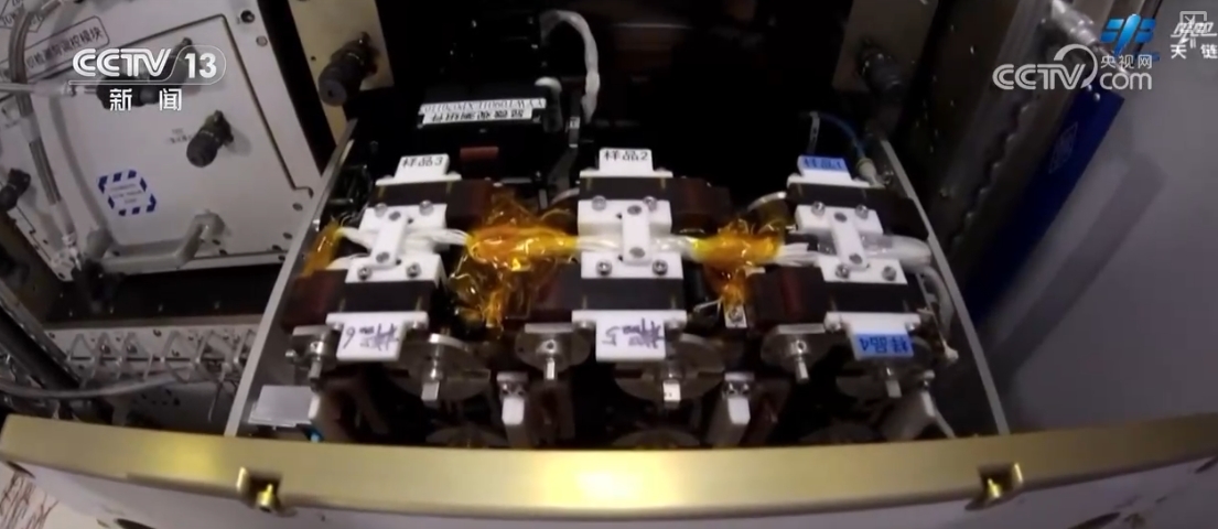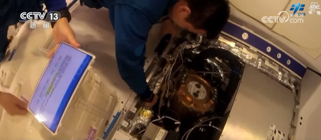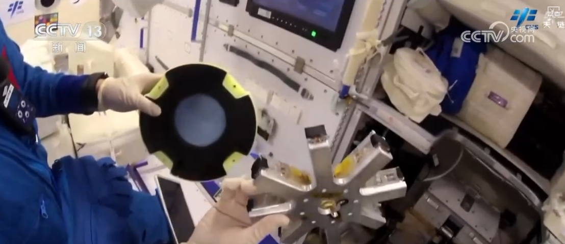 乘組還完成了流體物理實(shí)驗(yàn)柜固液介觀實(shí)驗(yàn)單元樣品盤檢查、實(shí)驗(yàn)樣品更換,無(wú)容器柜實(shí)驗(yàn)腔體樣品清理、實(shí)驗(yàn)樣品更換、軸心機(jī)構(gòu)電極維護(hù)等多項(xiàng)操作。