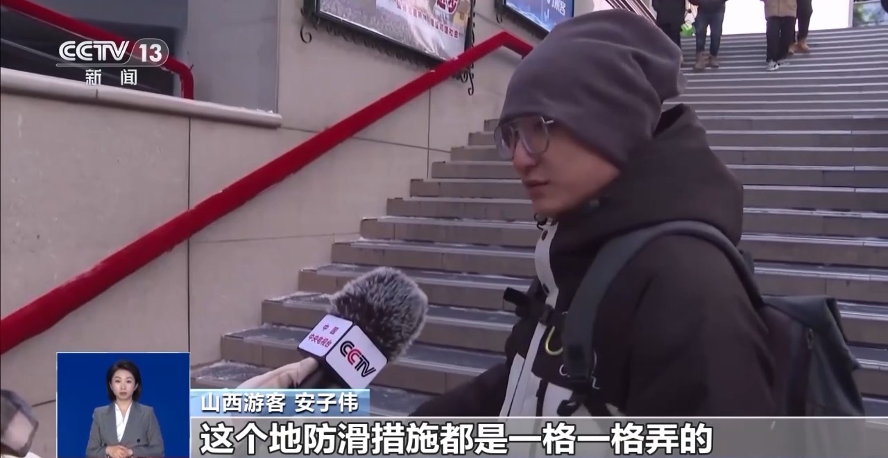 山西游客 安子偉:這個(gè)地防滑措施都是一格一格弄的,有橡膠還有鋁合金。扶手也做了一些保暖措施,不管是旅游相關(guān)人員,還是哈爾濱的市民,對(duì)我們都很熱情,東北人熱情“嘎嘎的”。