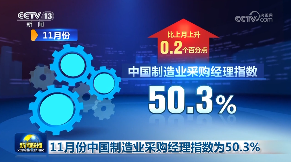 11月份中國(guó)制造業(yè)采購(gòu)經(jīng)理指數(shù)為50.3%,比上月上升0.2個(gè)百分點(diǎn)。