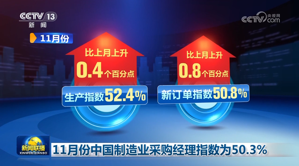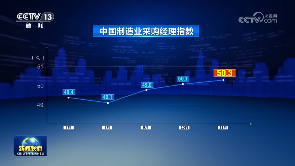 中國(guó)物流與采購(gòu)聯(lián)合會(huì)、國(guó)家統(tǒng)計(jì)局11月30日公布11月份中國(guó)制造業(yè)采購(gòu)經(jīng)理指數(shù)。隨著一系列存量政策和增量政策持續(xù)協(xié)同發(fā)力,制造業(yè)采購(gòu)經(jīng)理指數(shù)擴(kuò)張步伐有所加快,我國(guó)經(jīng)濟(jì)景氣水平總體保持穩(wěn)定擴(kuò)張。