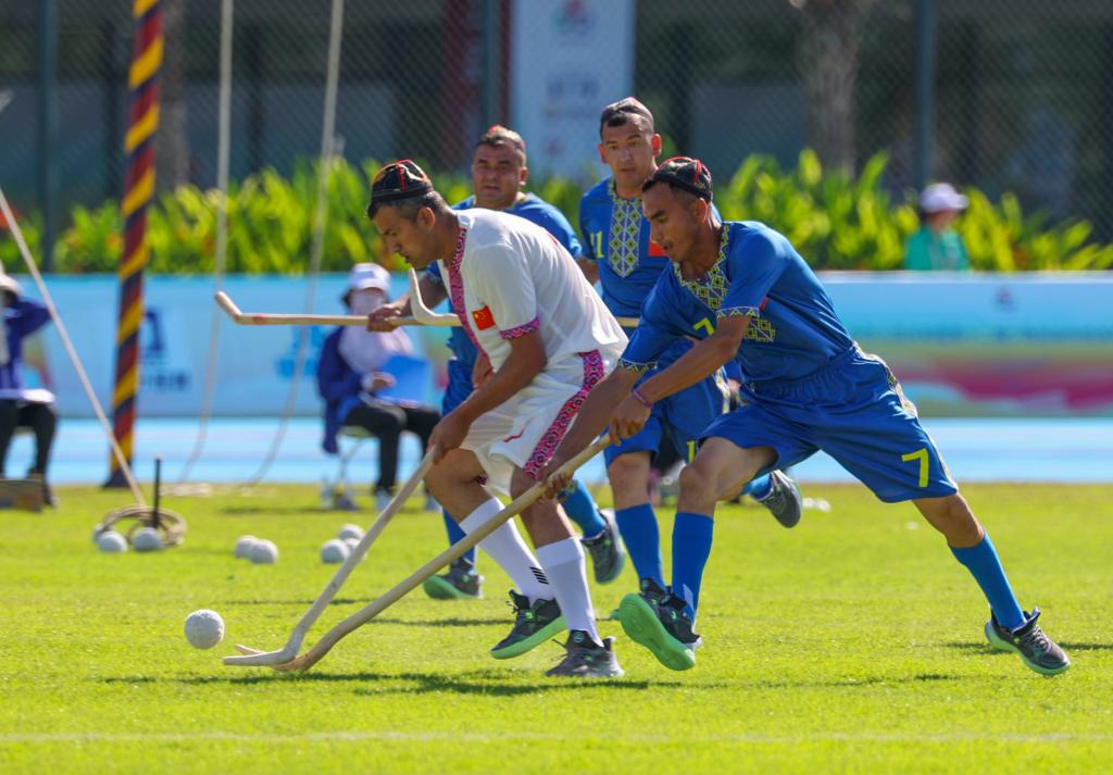 11月24日,在三亞市體育中心舉行的第十二屆全國少數(shù)民族傳統(tǒng)體育運動會室外表演項目中,新疆隊球員阿卜杜拉艾孜則·阿卜杜海娃爾(前右)在麥熱球表演中。新華社記者 陳朔 攝