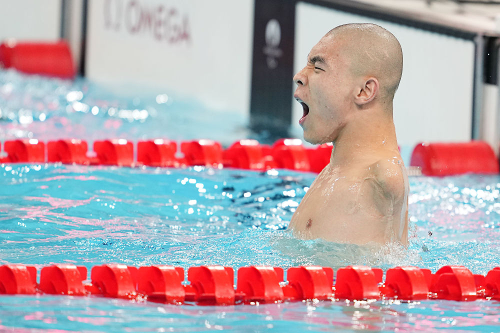 巴黎殘奧會游泳男子50米蝶泳S5級決賽,郭金城在打破世界紀錄后慶祝。新華社記者 熊琦 攝
