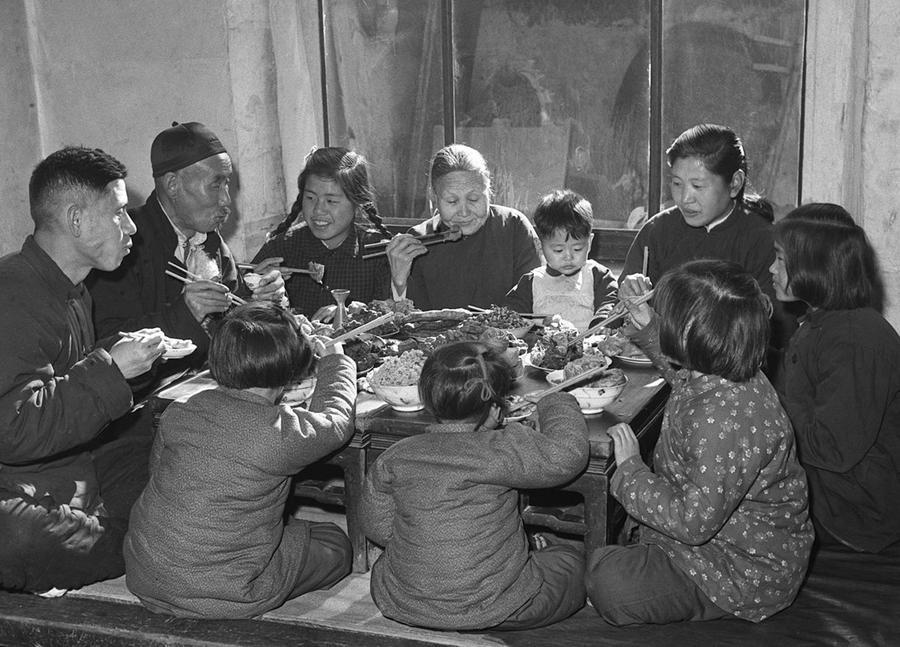 1959年春節(jié),天津居民王德鑄(左一)一家人在吃團圓飯。 新華社記者 盛果 攝