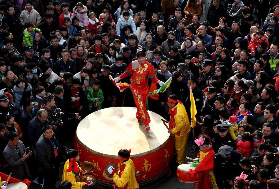 2018年3月2日,一支鑼鼓隊在河南??h古廟會上表演。 新華社記者 李安 攝