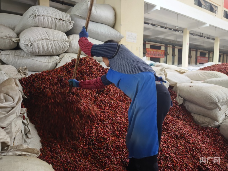 工人正在對辣椒進行堆積,等待分裝(央廣網(wǎng)記者 欒小琳 攝)