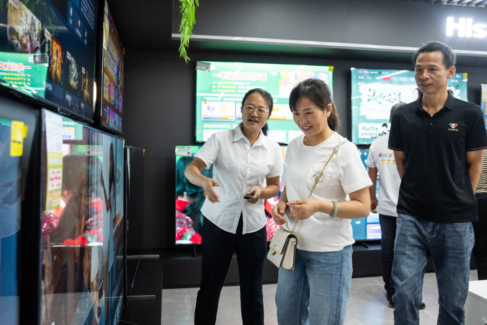 在湖南省岳陽市汨羅市屈子祠鎮(zhèn)雙楚村,彭坤、彭建華夫婦家中有一臺使用了近十年的32英寸液晶電視機。今年,在以舊換新政策的吸引下,他們決定更換一臺更大更好的電視機。根據(jù)實際需求和個人喜好,在反復(fù)對比后,他們換購了一臺75英寸的新款液晶電視機。舊電視在新機送貨上門時被當(dāng)場回收,疊加各種補貼后,實際成交價較廠商定價優(yōu)惠了近30%。(新華社記者 陳思汗 攝)