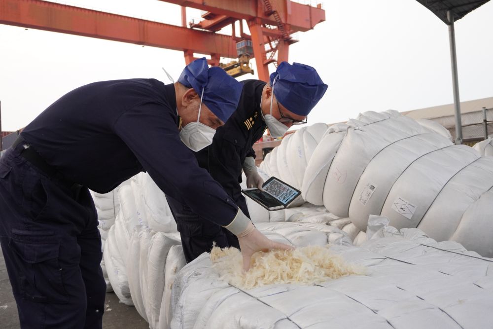 海關(guān)工作人員正在對(duì)水洗羽毛羽絨進(jìn)行檢查。新華社發(fā)