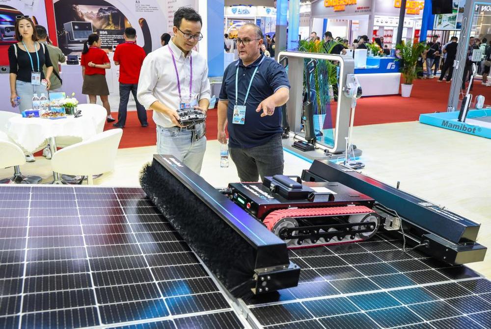 10月15日,采購商在第136屆廣交會(huì)展館了解一款太陽能面板自動(dòng)清潔機(jī)器人產(chǎn)品。(新華社記者 劉大偉 攝)