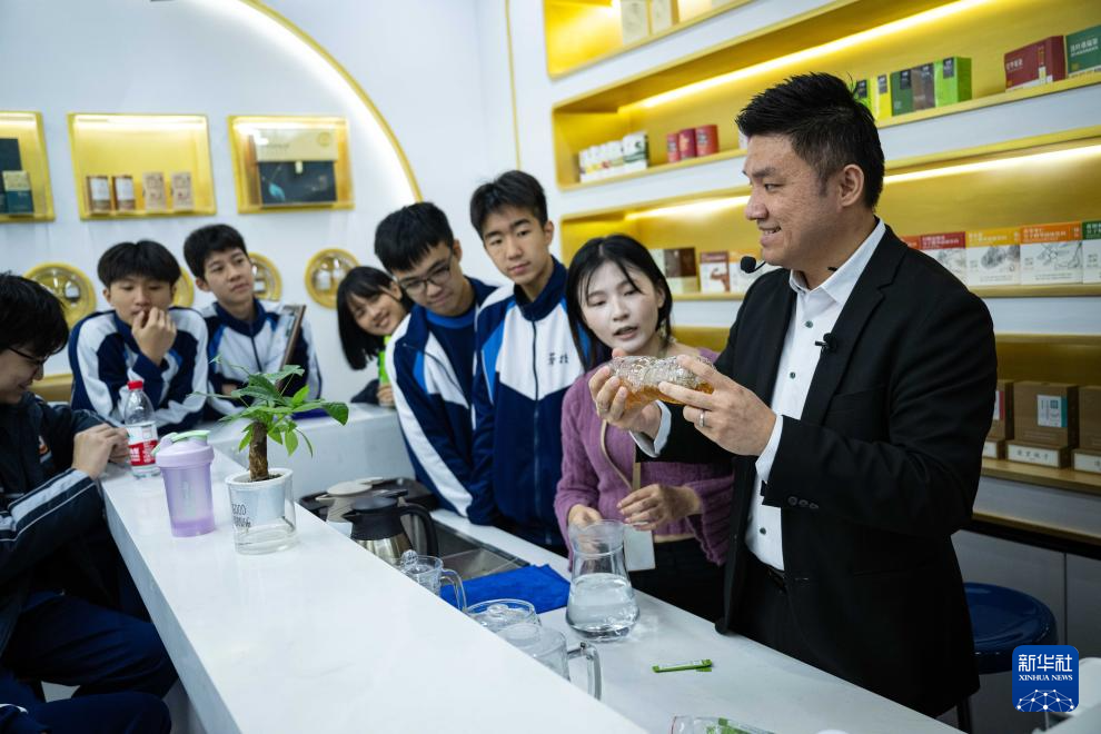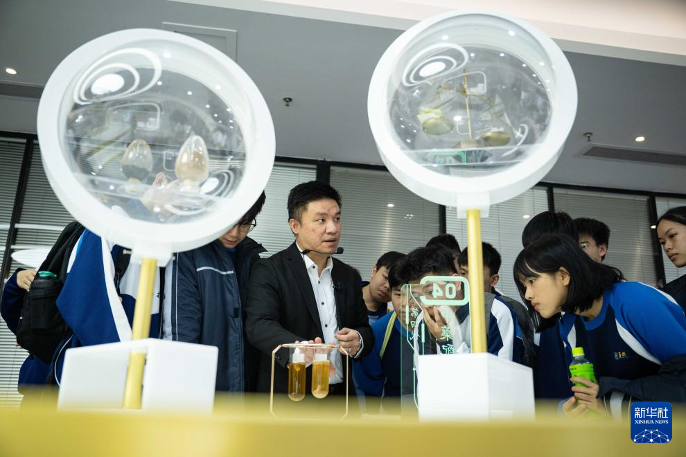 12月11日,黃滋才(右一)在位于橫琴的分子態(tài)(珠海橫琴)中醫(yī)藥健康產(chǎn)業(yè)發(fā)展有限公司的植物(現(xiàn)代中藥)分子博物館內(nèi)與澳門(mén)勞校中學(xué)的學(xué)生交流。