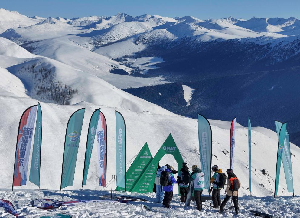 12月4日,世界野雪巡回賽新疆禾木站工作人員在禾木吉克普林國際滑雪度假區(qū)勘查比賽場地(無人機(jī)照片)。新華社記者 胡虎虎 攝