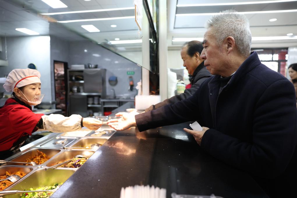 11月22日,在華亭市東華鎮(zhèn)東華綜合養(yǎng)老服務(wù)中心,老人在餐廳窗口打飯。新華社記者 陳斌 攝