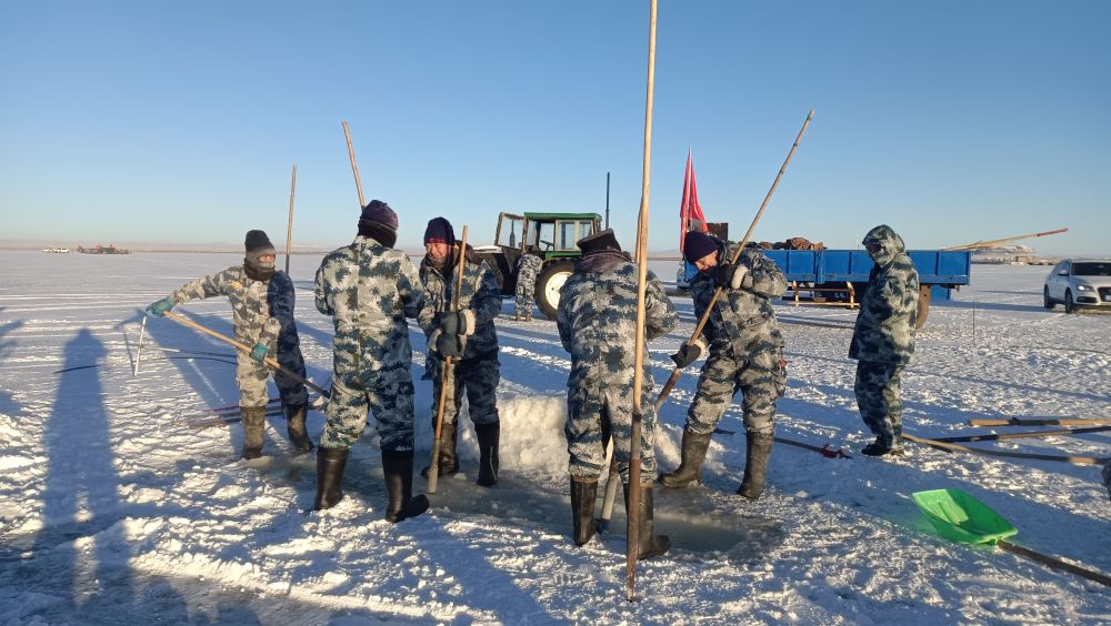遼闊的達里湖銀裝素裹,在零下二十?dāng)z氏度左右的嚴(yán)寒中,漁業(yè)工人們開始了一系列精細而有序的冬捕作業(yè)準(zhǔn)備工作。