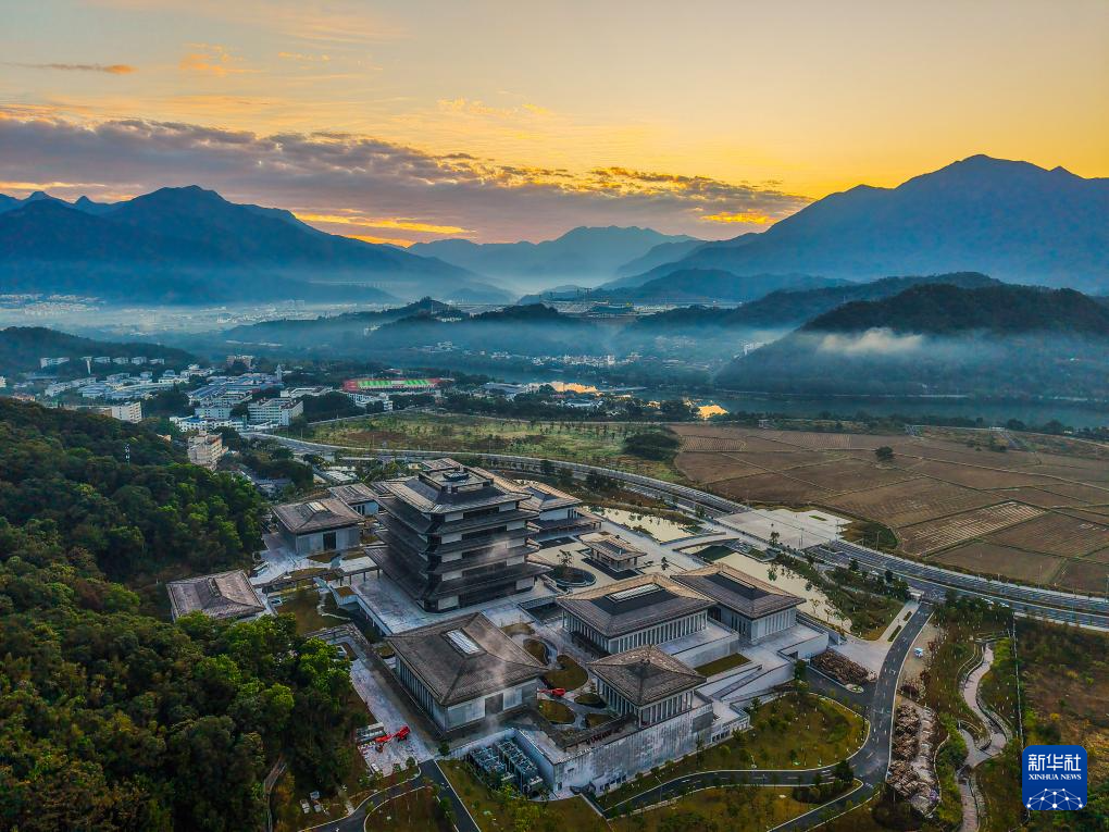 沐浴在晨曦中的廣州國家版本館(2024年12月3日攝,無人機(jī)照片)。