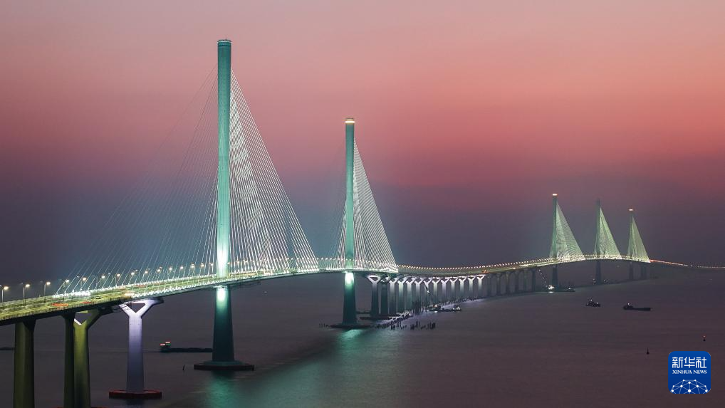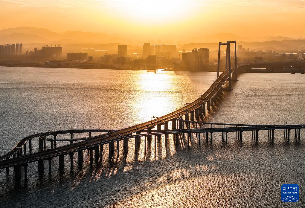 暮色中的黃茅??绾Mǖ栏邫诟鄞髽颍ㄗ髠?cè)雙主塔)和黃茅海大橋(右側(cè)三主塔)(2024年12月7日攝,無人機(jī)照片)。